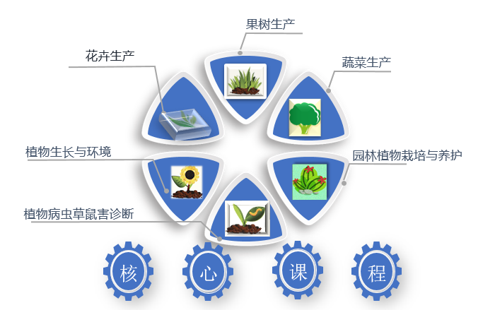 花卉生产,果树生产、蔬菜生产、园林植物栽培与养护、植物生长与环境、植物病虫草鼠害诊断等。